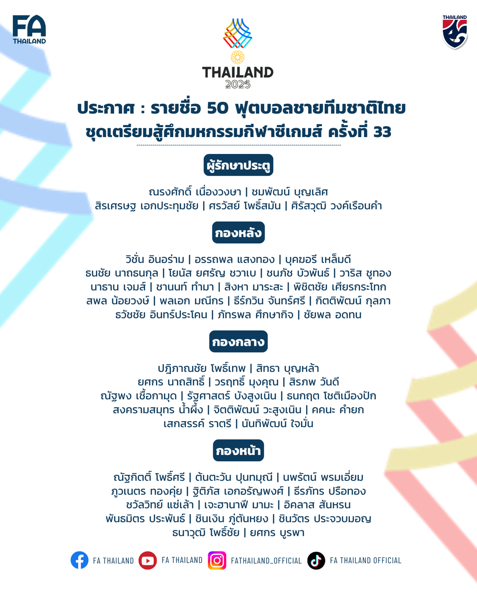 สมาคมกีฬาฟุตบอลแห่งประเทศไทย ในพระบรมราชูปถัมภ์ ประกาศรายชื่อ 50 นักกีฬาฟุตบอลชายทีมชาติไทย ที่อยู่ในการพิจารณา สำหรับทำการแข่งขันฟุตบอลชายในมหกรรมซีเกมส์ ครั้งที่ 33 ที่ประเทศไทยเป็นเจ้าภาพ ระหว่างวันที่ 3-20 ธันวาคม 2568