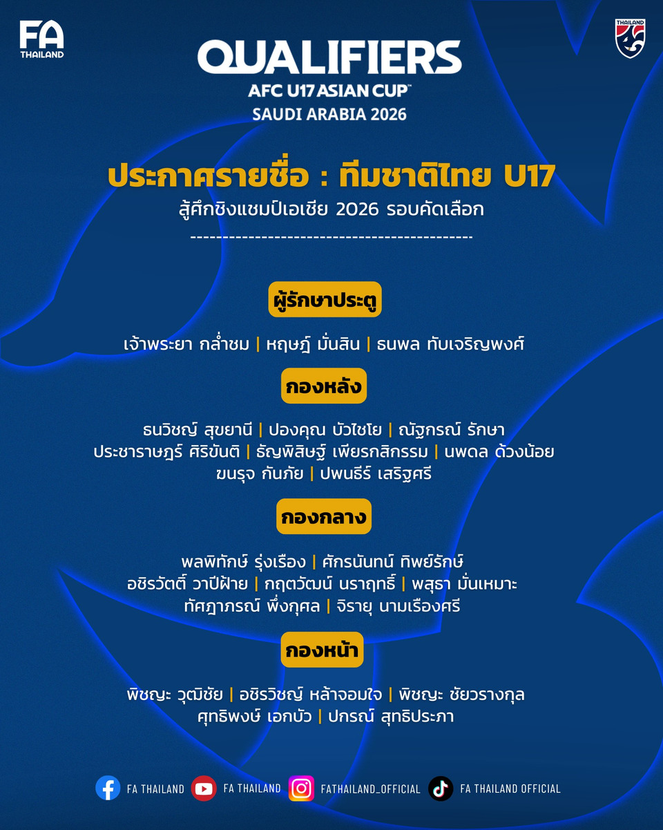 สมาคมกีฬาฟุตบอลแห่งประเทศไทย ในพระบรมราชูปถัมภ์ ประกาศรายชื่อ 23 นักฟุตบอลชายทีมชาติไทย รุ่นอายุไม่เกิน 17 ปี เก็บตัวฝึกซ้อม สำหรับทำการแข่งขันฟุตบอลชายชิงแชมป์เอเชียรุ่นอายุไม่เกิน 17 ปี รอบคัดเลือก (AFC U17 Asian Cup Saudi Arabia 2026 Qualifiers) ระหว่างวันที่ 22-30 พฤศจิกายน 2568