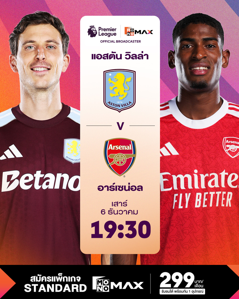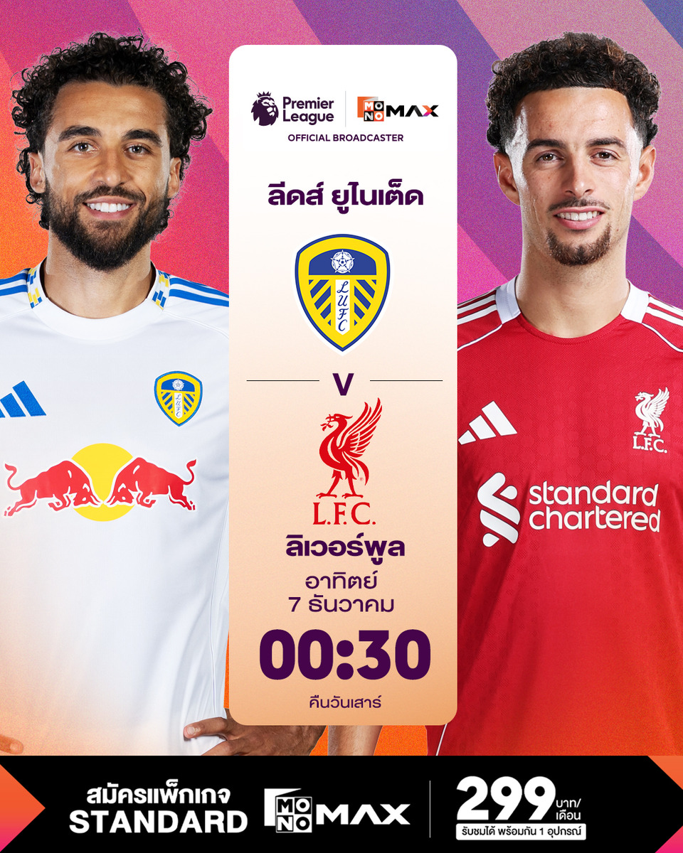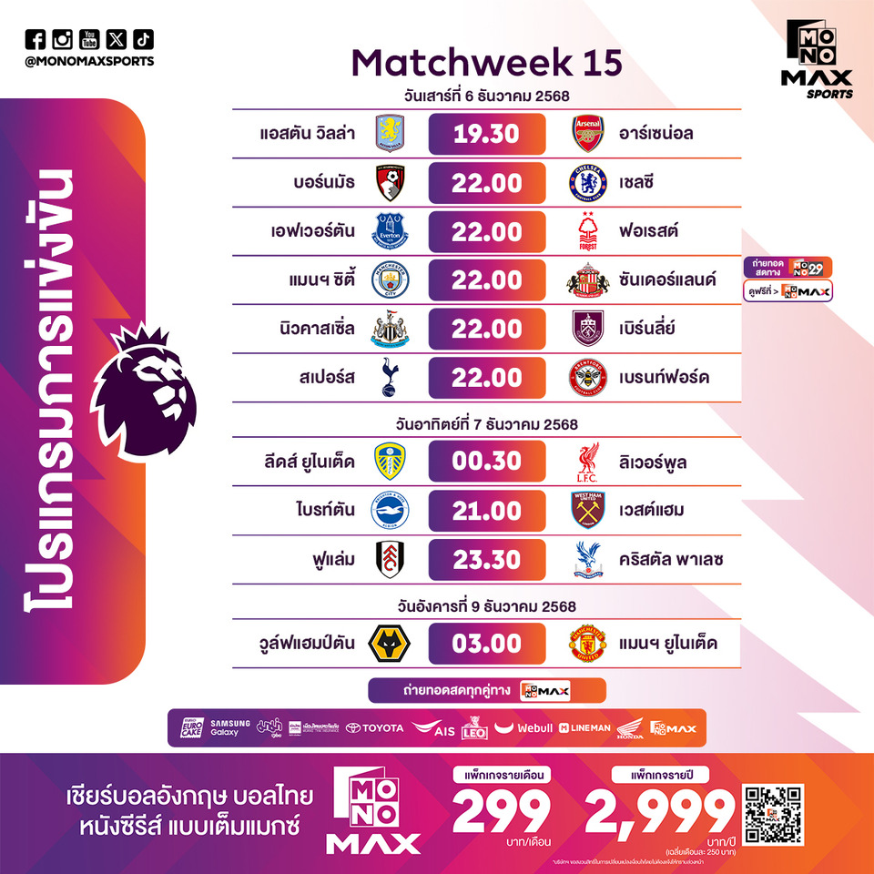 เปิดหัวสัปดาห์ใน วันเสาร์ที่ 6 ธันวาคม 2568 เวลา 19.30 น. ถ่ายทอดสดทาง Monomax ด้วยบิ๊กแมตซ์สุดเดือดที่วิลล่า พาร์ก แอสตัน วิลล่า ปะทะ อาร์เซน่อล ที่ต้องการแต้มยึดตำแหน่งหัวตาราง เป็นเกมที่ลุ้นเดือดตั้งแต่นาทีแรกแน่นอน ต่อด้วย เวลา 22.00 น. ระเบิดความมันส์พร้อมกันถึง 5 คู่ เริ่มจาก เดอะ เชอร์รี่ส์ พร้อมเปิดเกมรุกในบ้านรับ สิงห์บลูส์ เกมนี้เป็นบทพิสูจน์ความคมของเชลซีว่าจะเก็บสามแต้มได้หรือไม่, ทอฟฟี่สีน้ำเงิน ต้องการสามแต้มเพื่อขยับอันดับอย่างเร่งด่วน เปิดบ้านรับ เจ้าป่า, เรือใบ เตรียมปะทะ แมวดำ พร้อมเน้นเกมรับลึกแล้วสวนกลับ ซึ่งคู่นี้ถ่ายทอดสดพิเศษทั้ง Monomax และ ช่อง MONO29, นิวคาสเซิล ยูไนเต็ด เปิดบ้านพบ เบิร์นลี่ย์ ถือเป็นอีกเกมที่น่าจับตามอง และ ท็อตแน่ม ฮ็อทสเปอร์ เตรียมรับมือ เบรนท์ฟอร์ด การปะทะกันของสองทีมที่เน้นเกมรุกทำให้เกมนี้มีลุ้นจังหวะหวาดเสียวต่อเนื่องแบบไม่เบื่อ ก่อนจะต่อเนื่องกับคู่มันส์ซันเดย์ใน วันอาทิตย์ที่ 7 ธันวาคม 2568 เวลา 00.30 น. (คืนวันเสาร์ที่ 6 ธันวาคม 2568) รับชมทาง Monomax เมื่อ ลีดส์ ยูไนเต็ด เปิดเอลแลนด์ โรดพบ ลิเวอร์พูล หนึ่งในแมตช์ที่ดุเดือดของสัปดาห์