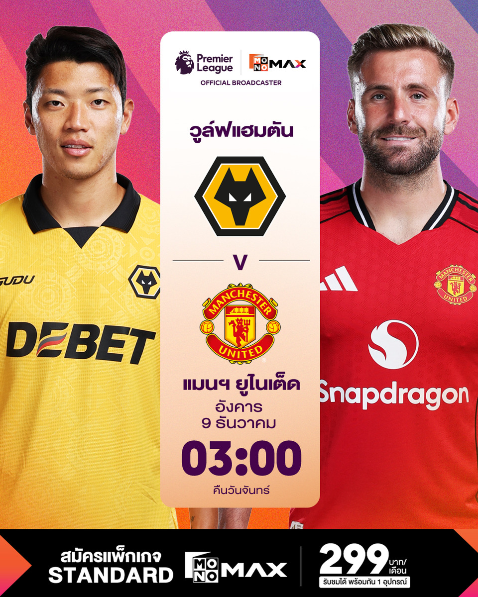 ส่งท้ายคืน วันอังคารที่ 9 ธันวาคม 2568 เวลา 03.00 น. (คืนวันจันทร์ที่ 8 ธันวาคม 2568) ส่งท้ายความมันส์ “หมาป่า” วูล์ฟแฮมป์ตัน วันเดอเรอร์ส เปิดถ้ำโมลินิวซ์รับทัพ “ปีศาจแดง” แมนเชสเตอร์ ยูไนเต็ด ที่ต้องการเร่งเก็บแต้มปลายปี ทั้งสองทีมมีทีเด็ดในเกมสวนกลับกันมากแค่ไหน รับชมทาง Monomax