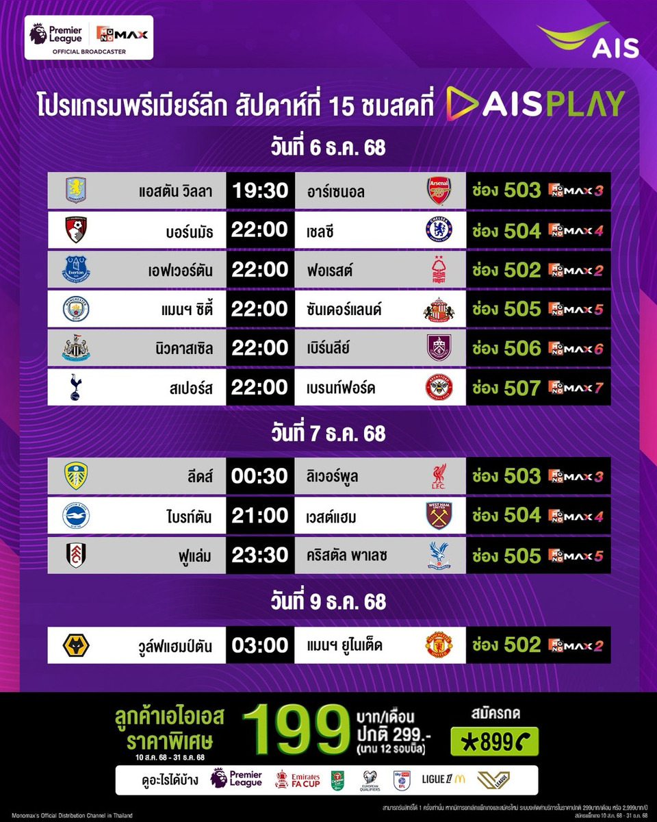 แฟนฟุตบอลอังกฤษ สามารถเชียร์ทีมรักของตัวเอง ผ่าน AIS PLAY แพ็คเกจ PLAY MONOMAX Standard ที่นอกจากฟุตบอลพรีเมียร์ลีกแล้ว ยังสามารถรับชมการแข่งขันรายการอื่นๆ เช่น คาราบาว คัพ, เอมิเรตส์ เอฟเอ คัพ, ลีก เอิง ฝรั่งเศส, ฟุตบอลโลก 2026 รอบคัดเลือก โซนยุโรป, วอลเลย์บอล SV League ของญี่ปุ่น, LFCTV, MUTV, Real Madrid TV และความบันเทิงอื่นๆ จาก MONOMAX ด้วยราคาพิเศษที่เอไอเอสเท่านั้น รายเดือนเพียง 199 บาท นาน 12 รอบบิล (ปกติ 299 บาท) สมัครกด *899 โทรออก หรือคลิก https://m.ais.co.th/PLmapfb หรือรายปีสุดคุ้ม 1,999 บาท (ปกติ 2,999 บาท) สมัครกด *899*1 โทรออก หรือคลิก https://m.ais.co.th/PLyapfb ตั้งแต่ 10 สิงหาคม 2568 – 31 ธันวาคม 2568