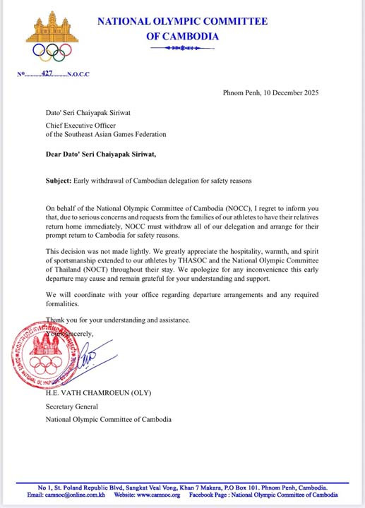 ในนามของคณะกรรมการโอลิมปิกแห่งชาติกัมพูชา (NOCC) ข้าพเจ้าขอแจ้งให้ทราบด้วยความเสียใจว่า เนื่องจากความกังวลอย่างยิ่งและคำขอจากครอบครัวของนักกีฬาของเราที่ต้องการให้ญาติของพวกเขากลับบ้านโดยทันที