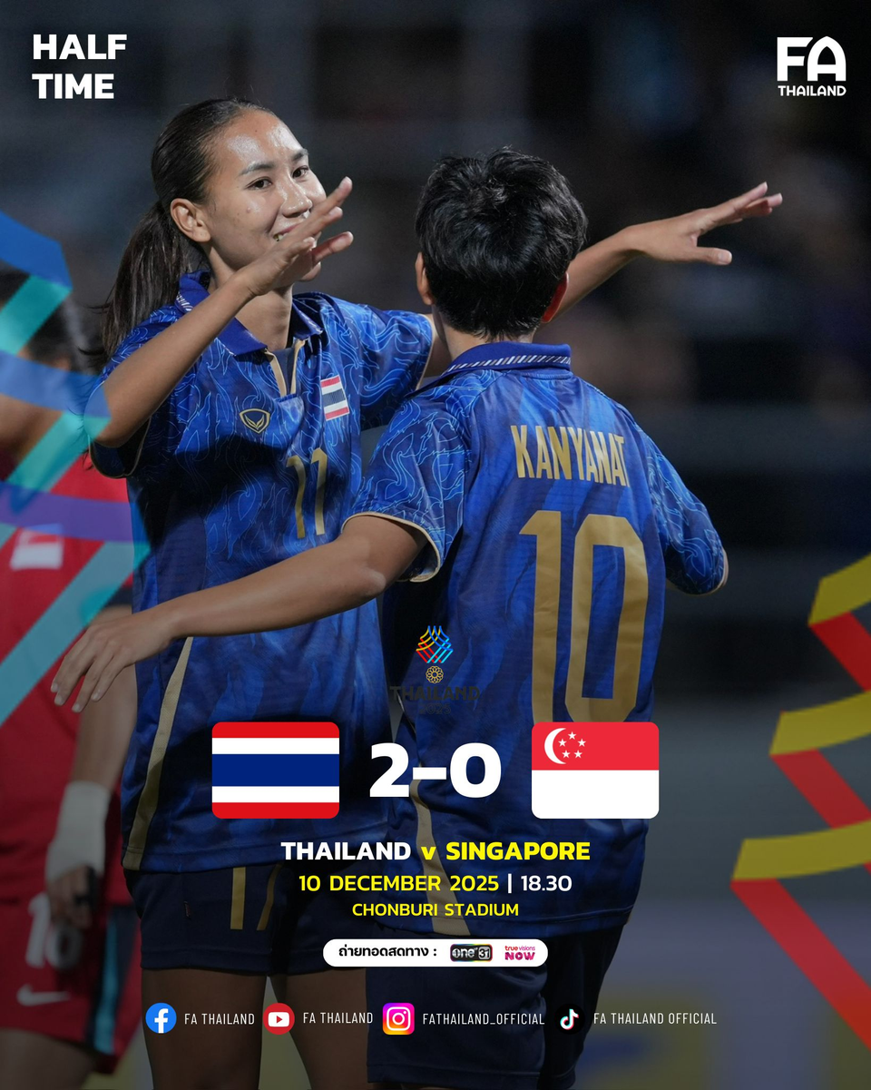 วันที่ 10 ธันวาคม 2568 เวลา 18.30 น. ณ ชลบุรี สเตเดียม การแข่งขันฟุตบอลหญิง ในมหกรรมซีเกมส์ ครั้งที่ 33 กลุ่มเอ นัดที่สอง ทีมชาติไทย ลงสนามพบกับ สิงคโปร์