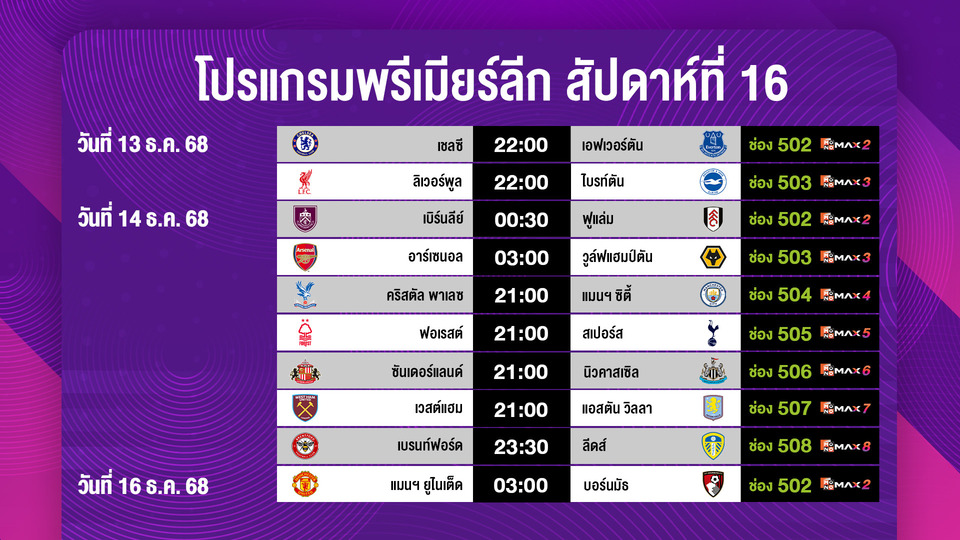 โปรแกรมถ่ายทอดสดฟุตบอลพรีเมียร์ลีก อังกฤษ นัดที่ 16 ของฤดูกาล ดังนี้