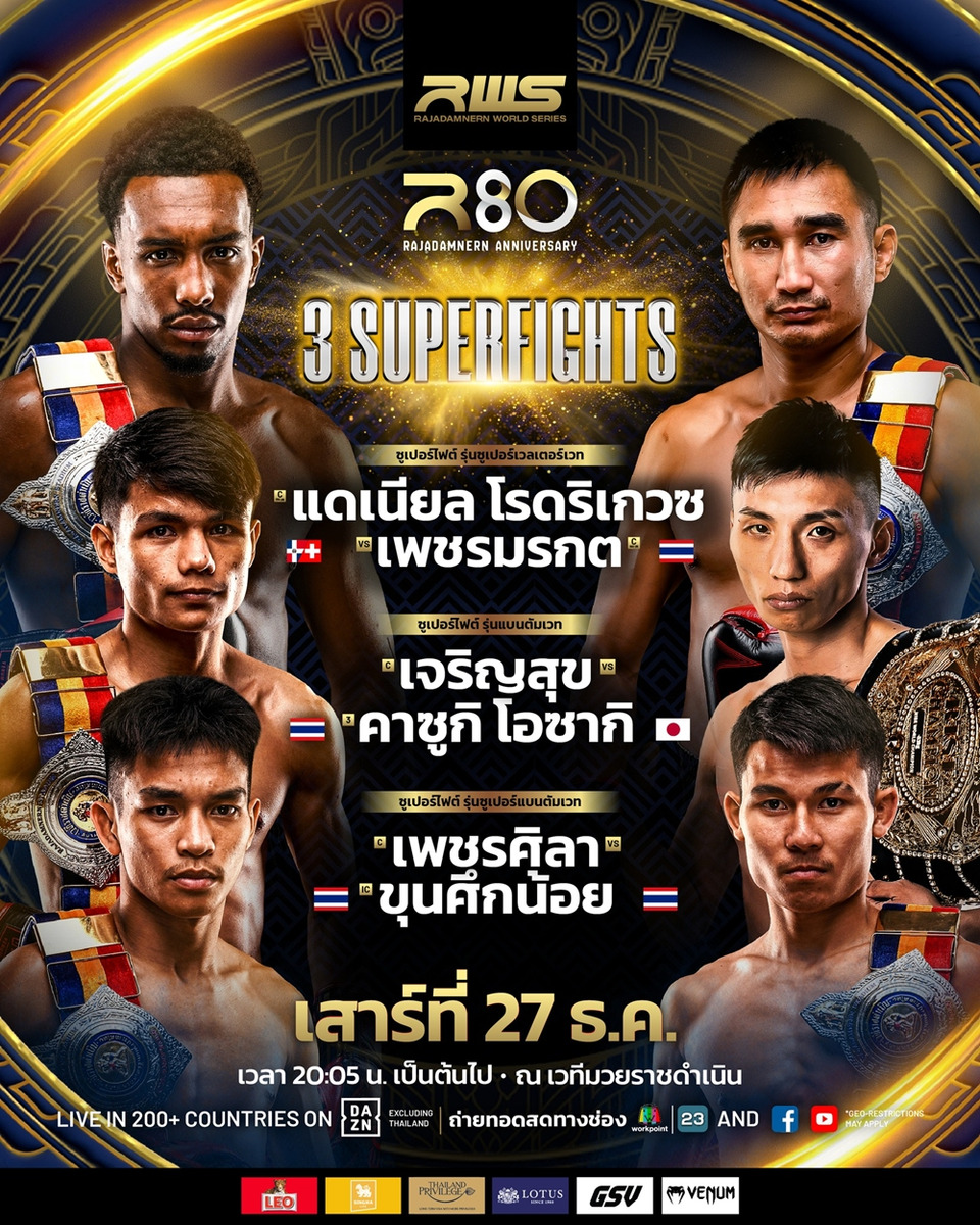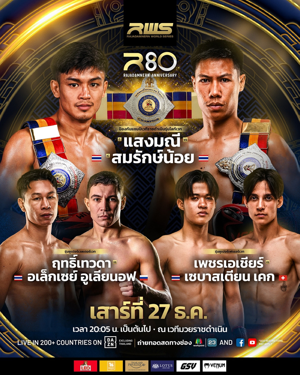 นี่ถือเป็นอีเวนต์ที่ยิ่งใหญ่ที่สุดของปีนี้ ขอเชิญแฟนมวยชาวไทยร่วมเป็นสักขีพยานในศึกแห่งเกียรติยศครั้งประวัติศาสตร์ สัมผัสความมันส์ระดับโลกแบบติดขอบสังเวียนอย่างใกล้ชิด โดยสามารถซื้อตั๋วเข้าชมได้แล้ววันนี้ที่เว็บไซต์ www.rajadamnern.com การแข่งขันจะจัดขึ้นในวันเสาร์ที่ 27 ธันวาคม 2568 ตั้งแต่เวลา 18.00 น. เป็นต้นไป ณ เวทีมวยราชดำเนิน กรุงเทพมหานคร ผู้สนใจดูติดตามรายละเอียดเพิ่มเติม ข่าวสารความเคลื่อนไหว และช่องทางการรับชม ได้ทาง Facebook, Instagram, Youtube และ TikTok ของ RWS – Rajadamnern World Series