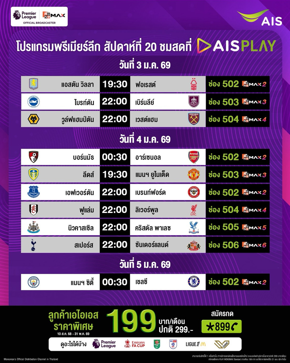 19.30 น. แอสตัน วิลล่า พบ ฟอเรสต์ : AIS PLAY 502 (MONOMAX2)