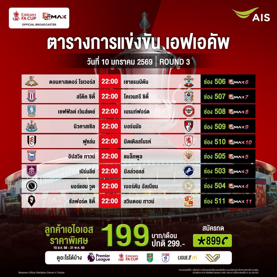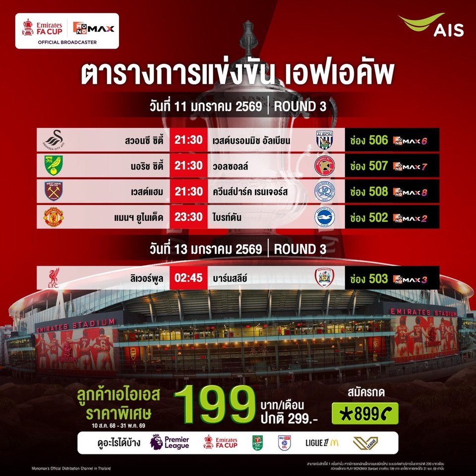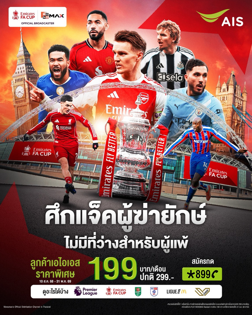 แฟนฟุตบอลอังกฤษ สามารถเชียร์ทีมรักของตัวเอง ผ่าน AIS PLAY แพ็คเกจ PLAY MONOMAX Standard ที่นอกจากฟุตบอลพรีเมียร์ลีกแล้ว ยังสามารถรับชมการแข่งขันรายการอื่นๆ เช่น คาราบาว คัพ, เอมิเรตส์ เอฟเอ คัพ, ลีก เอิง ฝรั่งเศส, ฟุตบอลโลก 2026 รอบคัดเลือก โซนยุโรป, วอลเลย์บอล SV League ของญี่ปุ่น, LFCTV, MUTV, Real Madrid TV และความบันเทิงอื่นๆ จาก MONOMAX ด้วยราคาพิเศษที่เอไอเอสเท่านั้น รายเดือนเพียง 199 บาท ตั้งแต่วันนี้-31 พฤษภาคม 2569 (สามารถสมัครและรับชมราคานี้ได้ถึงวันที่ 31 พฤษภาคม 2569) สมัครกด *899 โทรออก หรือคลิก https://m.ais.co.th/PLmapfb ดูหนังออนไลน์ ดูซีรีส์ออนไลน์ ดูช่องรายการทีวีออนไลน์ และคาราโอเกะ ครบทุกความสนุกได้ทุกที่ และความบันเทิงในแอปเดียว App ดูหนังออนไลน์กับ AIS Play App