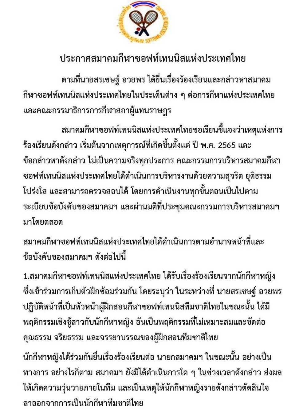 ประกาศสมาคมกีฬาซอฟท์เทนนิสแห่งประเทศไทย ตามที่นายสรเชษฐ์ อวยพร ได้ยื่นเรื่องร้องเรียนและกล่าวหาสมาคมกีฬาซอฟท์เทนนิสแห่งประเทศไทยในประเด็นต่าง ๆ ต่อการกีฬาแห่งประเทศไทย และคณะกรรมาธิการการกีฬาสภาผู้แทนราษฎร