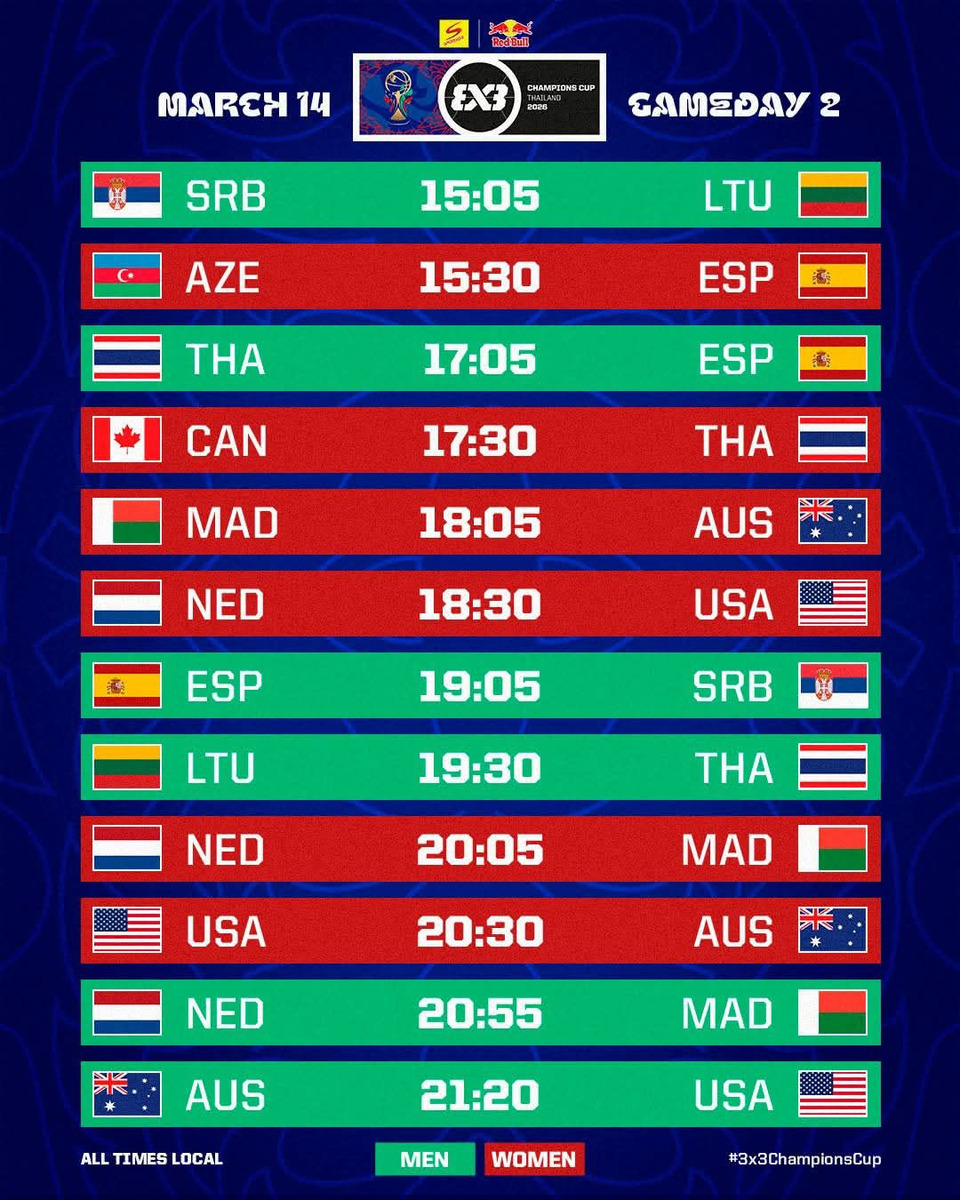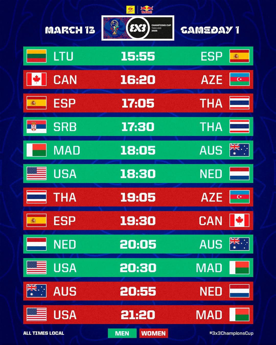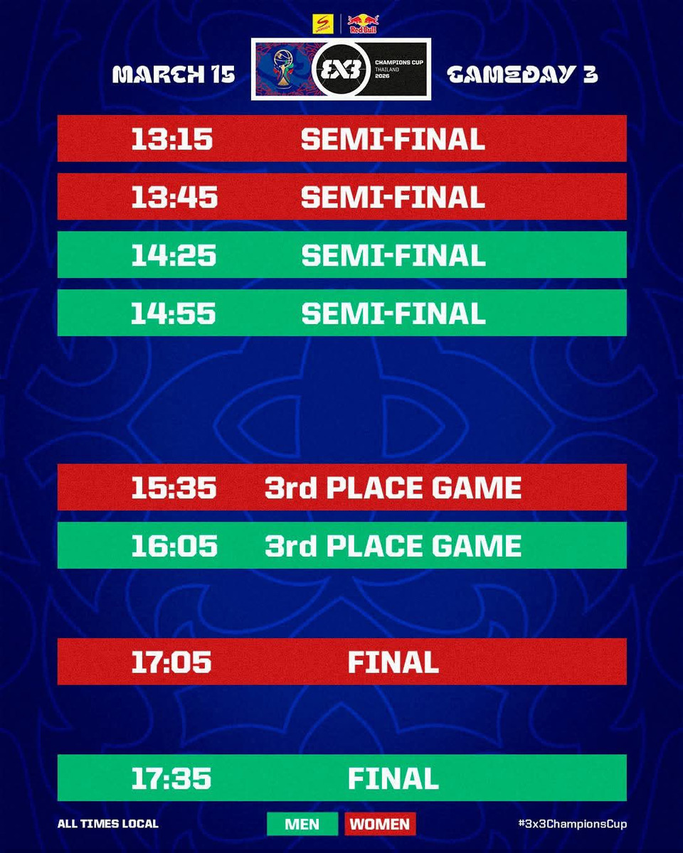 ร่วมชมการแข่งขันระดับโลก พร้อมส่งแรงใจ แรงเชียร์ให้นักกีฬา ทรีเอ็กซ์ทรี ทีมชาติไทย ในการแข่งขัน “ฟีบ้า ทรีเอ็กซ์ทรี สปอนเซอร์ - เรดบูล แชมป์เปี้ยนส์ คัพ 2026” (FIBA 3x3 Sponsor - Red Bull Champions Cup 2026) ระหว่างวันที่ 13-15 มีนาคมนี้ ตั้งแต่เวลา 15.00 – 22.00 น. ณ ลานหน้าศูนย์การค้าเซ็นทรัลเวิลด์ โดยตารางแข่ง 2 วันแรกของทีมชาติไทย