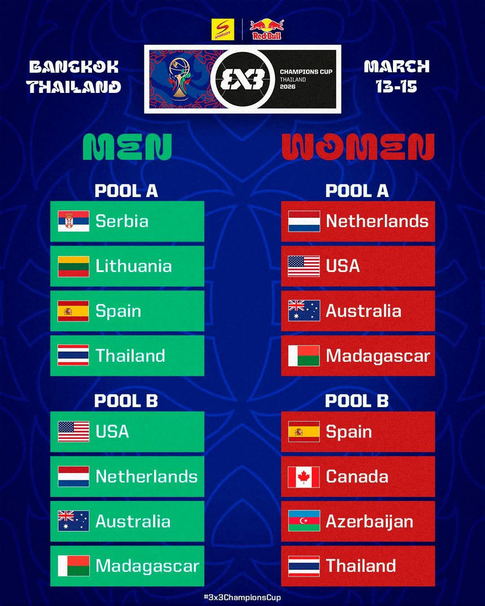 ศึกยัดห่วงระดับโลก “FIBA 3x3 Sponsor | Red Bull Champions Cup 2026” ได้ทำการจับสลากแบ่งสายอย่างเป็นทางการ เตรียมระเบิดความมันส์ระหว่างวันที่ 13–15 มีนาคมนี้ ณ ลานหน้าศูนย์การค้าเซ็นทรัลเวิลด์ กรุงเทพฯ โดยการแข่งขันครั้งนี้จัดขึ้นภายใต้ความร่วมมือของ สหพันธ์บาสเกตบอลนานาชาติ (FIBA) ร่วมกับการกีฬาแห่งประเทศไทย, กองทุนพัฒนากีฬาแห่งชาติ, สมาคมกีฬาบาสเกตบอลแห่งประเทศไทย, ช่อง 7HD และ เทโร เอ็นเทอร์เทนเม้นท์ โดยประเทศไทยรับหน้าที่เป็นเจ้าภาพ