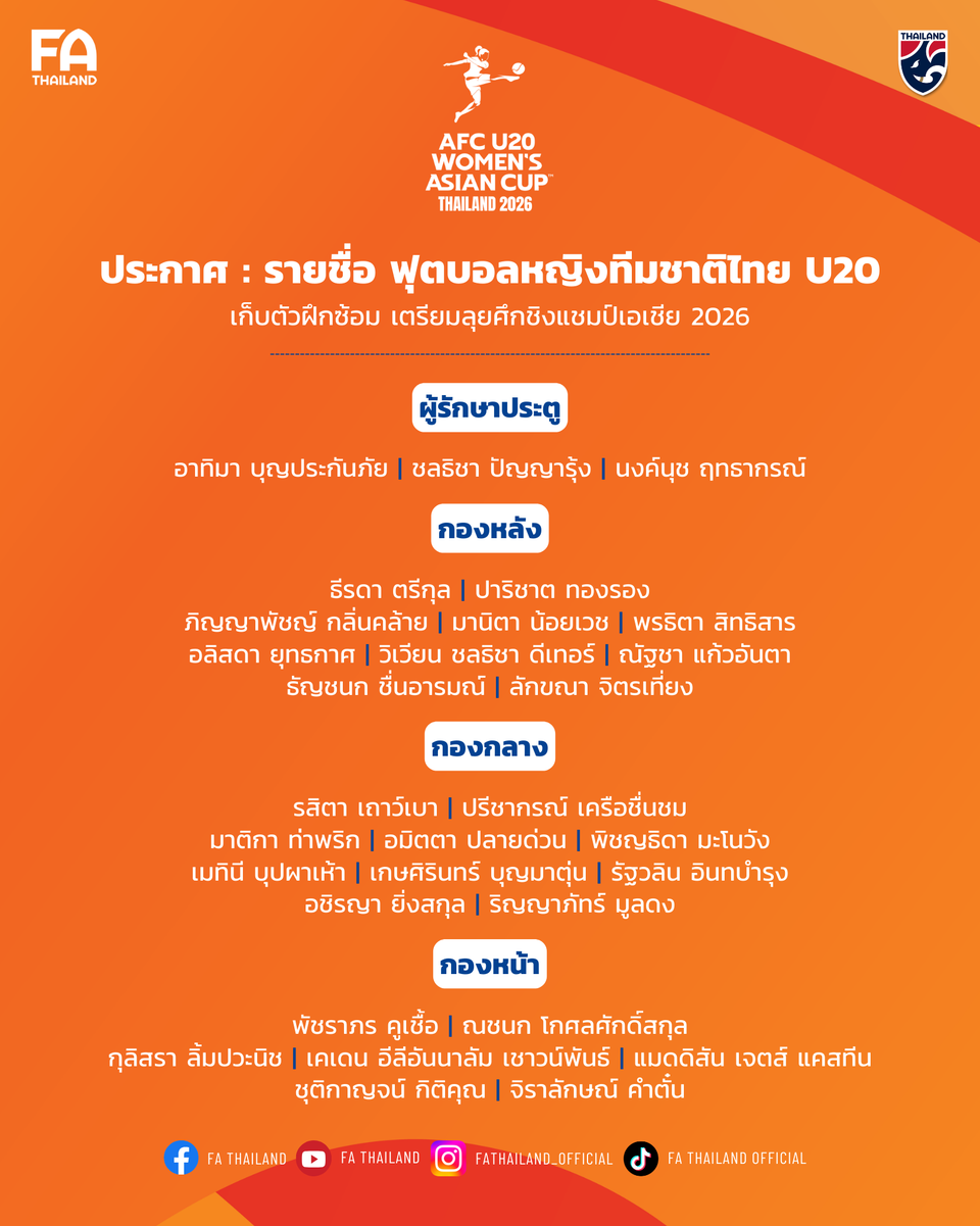 สมาคมกีฬาฟุตบอลแห่งประเทศไทย ในพระบรมราชูปถัมภ์ ประกาศรายชื่อ 30 นักฟุตบอลหญิงทีมชาติไทย รุ่นอายุไม่เกิน 20 ปี เพื่อเก็บตัวฝึกซ้อม เตรียมความพร้อมก่อนทำการแข่งขันฟุตบอลหญิงชิงแชมป์เอเชีย รุ่นอายุไม่เกิน 20 ปี 2026 (AFC U20 Women’s Asian Cup Thailand 2026) ระหว่างวันที่ 1-18 เมษายน 2569 ณ ธรรมศาสตร์ สเตเดียม จังหวัดปทุมธานี ภายใต้การคุมทัพของ "โค้ชหนึ่ง" หนึ่งฤทัย สระทองเวียน หัวหน้าผู้ฝึกสอน