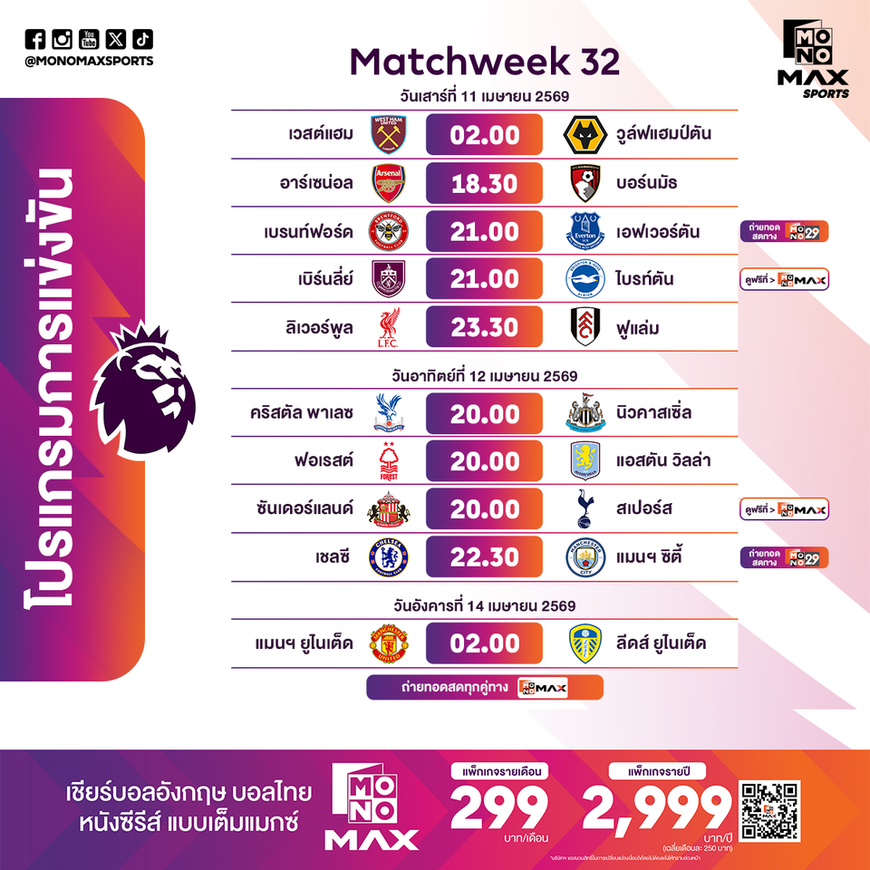ขยับสู่วันอาทิตย์ 12 เมษายน 2569 เวลา 20.00 น. Monomax ถ่ายทอดสดครบทั้งสามสนามพร้อมกัน เริ่มที่ คริสตัล พาเลซ ปะทะ นิวคาสเซิล ยูไนเต็ด ต่อด้วย น็อตติ้งแฮม ฟอเรสต์ พบ แอสตัน วิลลา เกมสำคัญของโซนครึ่งบน และ ซันเดอร์แลนด์ เจอ ท็อตแน่ม ฮ็อตสเปอร์ ก่อนปิดช่วงค่ำ เวลา 22.30 น.ถ่ายทอดสดทั้ง Monomax และ ช่อง MONO29 กับบิ๊กแมตช์ประจำสัปดาห์ เชลซี ปะทะ แมนเชสเตอร์ ซิตี้ เกมของทีมกลุ่มหัวตารางที่อาจชี้ชะตาต่อการลุ้นแชมป์และการจัดอันดับช่วงโค้งสุดท้ายโดยตรง