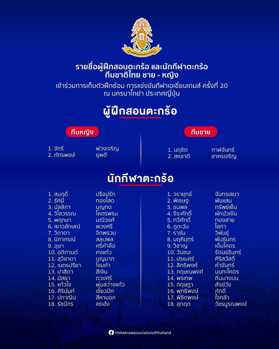 นายธนา ไชยประสิทธิ์ นายกสมาคมกีฬาตะกร้อแห่งประเทศไทย ได้ทำการประกาศรายชื่อผู้ฝึกสอนและนักกีฬาตะกร้อทีมชาติไทย ชาย-หญิง ที่จะเข้าร่วมการแข่งขันกีฬาเอเชี่ยนเกมส์ ครั้งที่ 20 ณ นครนาโกย่า ประเทศญี่ปุ่น โดยมีเป้าหมายชัดเจนว่าทีมตะกร้อไทยจะต้องกู้ศักดิ์ศรีกลับมาหลังจากผลงานที่ไม่เป็นไปตามคาดในซีเกมส์ครั้งก่อน และทวงคืนเหรียญทองกลับมาให้ได้