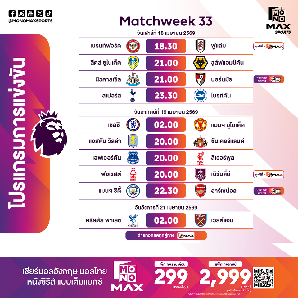 จากนั้นช่วงค่ำ วันอาทิตย์ที่ 19 เมษายน 2569 เวลา 20.00 น. Monomax ยิงสดพร้อมกันสามสนามเริ่มจาก แอสตัน วิลล่า พบ ซันเดอร์แลนด์ เจ้าบ้านหวังเก็บแต้มรักษาโมเมนตัม ขณะที่ทีมเยือนต้องการคะแนนหนีโซนอันตราย ต่อด้วยน็อตติ้งแฮม ฟอเรสต์ พบ เบิร์นลีย์ เกมสำคัญของทีมกลางตารางที่ทุกคะแนนมีความหมาย และ เมอร์ซีย์ไซด์ดาร์บี้ เอฟเวอร์ตัน เปิดบ้านรับ ลิเวอร์พูล ศึกแห่งศักดิ์ศรีเมืองลิเวอร์พูลที่มักเต็มไปด้วยความดุดัน เข้มข้น ใครอยากชมคู่นี้ริมหาดจอยักษ์ แบบมันส์ สะใจ สามารถตามไปพบกันได้ที่ “สงกรานต์ พัทยา Watch Party on the Beach” ในวันอาทิตย์ที่ 19 เมษายน 2569 ณ ชายหาดพัทยา ก่อนปิดท้ายคืนวันอาทิตย์กับซูเปอร์บิ๊กแมตช์ เวลา 22.30 น. แมนเชสเตอร์ ซิตี้ เปิดศึก อาร์เซน่อล ที่อาจเป็นเกมชี้ชะตาการลุ้นแชมป์ฤดูกาลนี้ การดวลแท็กติกระดับท็อประหว่างสองทีมลุ้นแชมป์ที่ห้ามพลาด โดยคู่นี้ถ่ายทอดสดทั้ง Monomax และ ช่อง MONO29
