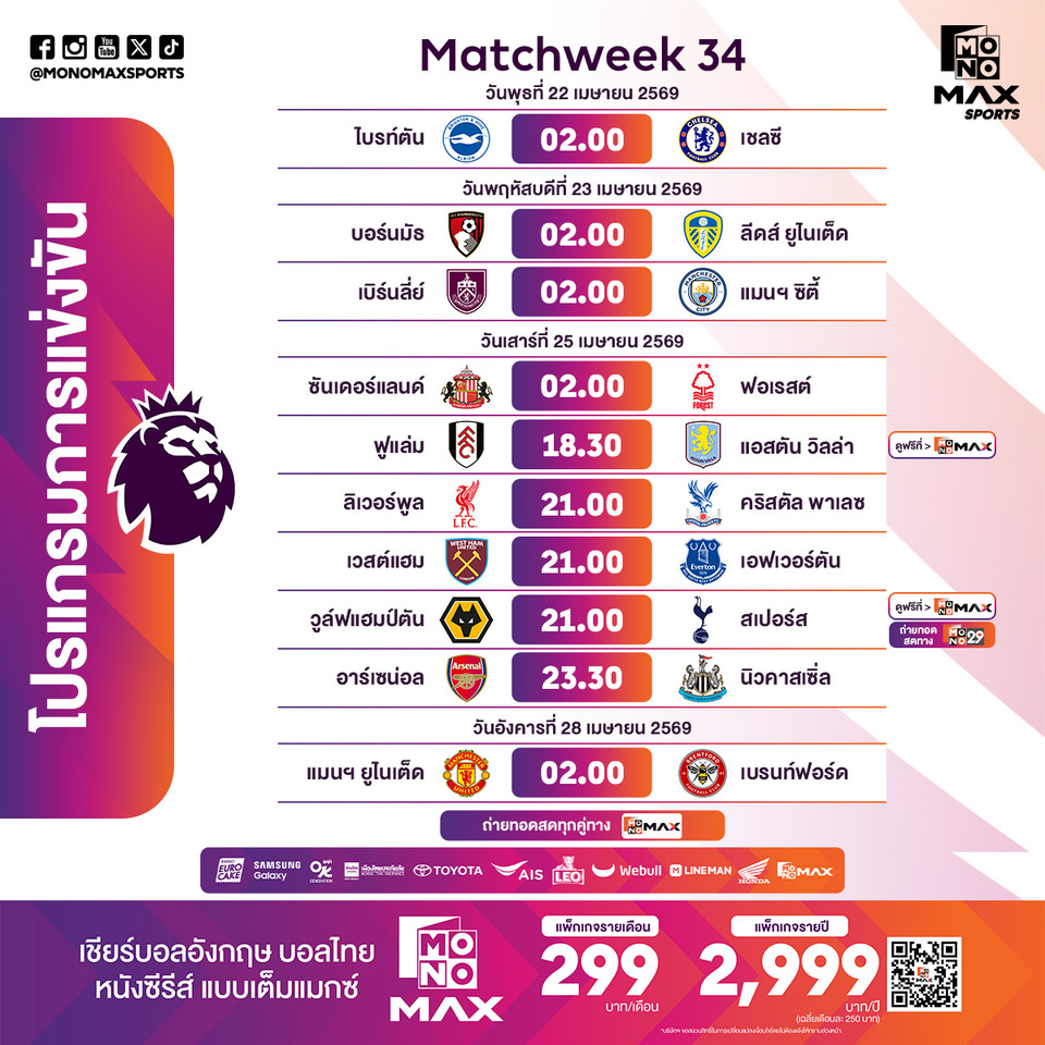 จากนั้นช่วงเย็นวันเสาร์ที่ 25 เมษายน 2569 เวลา 18.30 น. Monomax ยิงสดฟูแล่ม เปิดบ้านรับ แอสตัน วิลล่า เกมนี้มีเดิมพันเรื่องศักดิ์ศรีและอันดับตารางแบบเต็มพิกัด ต่อด้วย เวลา 21.00 น. เดินหน้าความเดือดพร้อมกันสามสนาม ทั้ง ลิเวอร์พูล พบ คริสตัล พาเลซ หงส์แดงยังคงต้องการแต้มเพื่อขยับอันดับ ขณะที่พาเลซขึ้นชื่อเรื่องเกมสวนกลับ อาจมีจุดเปลี่ยนตลอด 90 นาที, เวสต์แฮม ยูไนเต็ด ชน เอฟเวอร์ตัน ศึกแห่งศักดิ์ศรีของสองทีมใหญ่ที่ต้องการจบฤดูกาลให้แข็งแกร่ง และ วูล์ฟแฮมป์ตัน วันเดอเรอร์ส รับมือ ท็อตแน่ม ฮ็อตสเปอร์ โดยคู่นี้ถ่ายทอดสดทั้ง Monomax และ ช่อง MONO29 ก่อนปิดท้ายค่ำคืนวันเสาร์ใน เวลา 23.30 น. ด้วยเกมระดับท็อประหว่างอาร์เซน่อลกับนิวคาสเซิ่ลที่อาจส่งผลต่อการลุ้นแชมป์โดยตรง