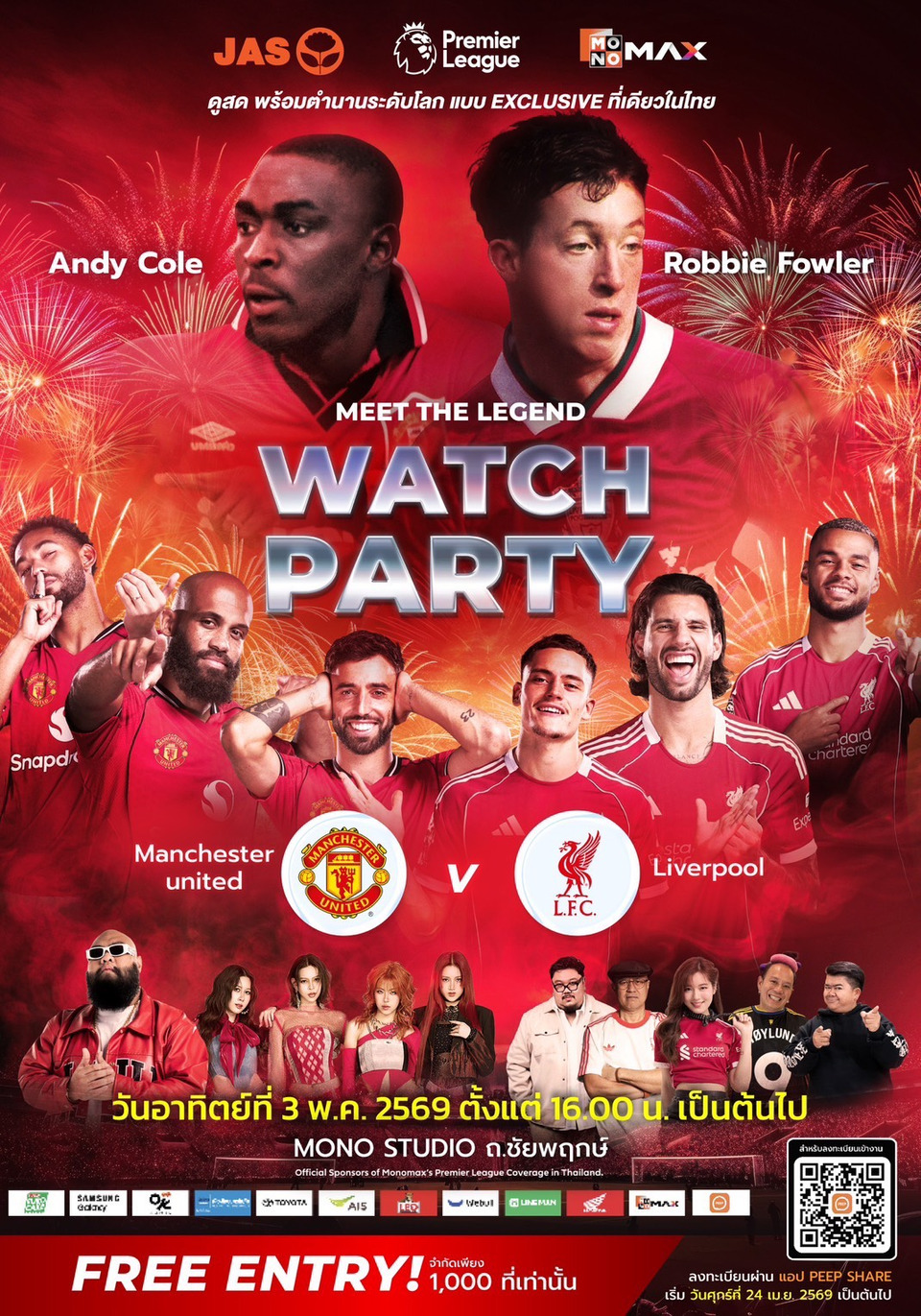 แฟนบอลชาวไทยเตรียมตัวให้พร้อมกับครั้งแรกที่ 2 ตำนานแดงเดือดจะปรากฏตัวพร้อมกันในประเทศไทย!!! บริษัท จัสมิน อินเตอร์เนชั่นแนล จำกัด (มหาชน) หรือ JAS ผู้ถือลิขสิทธิ์ฟุตบอลพรีเมียร์ลีกอังกฤษ และเอมิเรตส์เอฟเอคัพอย่างเป็นทางการ ร่วมกับ Monomax แพลตฟอร์มหลักในการถ่ายทอดสดฟุตบอลพรีเมียร์ลีกและเอมิเรตส์เอฟเอคัพตลอด 6 ฤดูกาล ชวนแฟนผีและเด็กหงส์ร่วมสร้างประสบการณ์ลูกหนังสุดเอ็กซ์คลูซีฟครั้งใหญ่ในไทยและรวมพลังส่งเสียงเชียร์บิ๊กแมตช์แดงเดือด “MONOMAX WATCH PARTY: RED MATCH” ระหว่าง แมนเชสเตอร์ ยูไนเต็ด พบ ลิเวอร์พูล พร้อมกระทบไหล่ 2 ตำนานดาวยิงระดับโลก บินตรงร่วมเชียร์ติดขอบจอ ในวันอาทิตย์ที่ 3 พฤษภาคม 2569 ตั้งแต่เวลา 16.00 น. เป็นต้นไป ณ Mono Studio