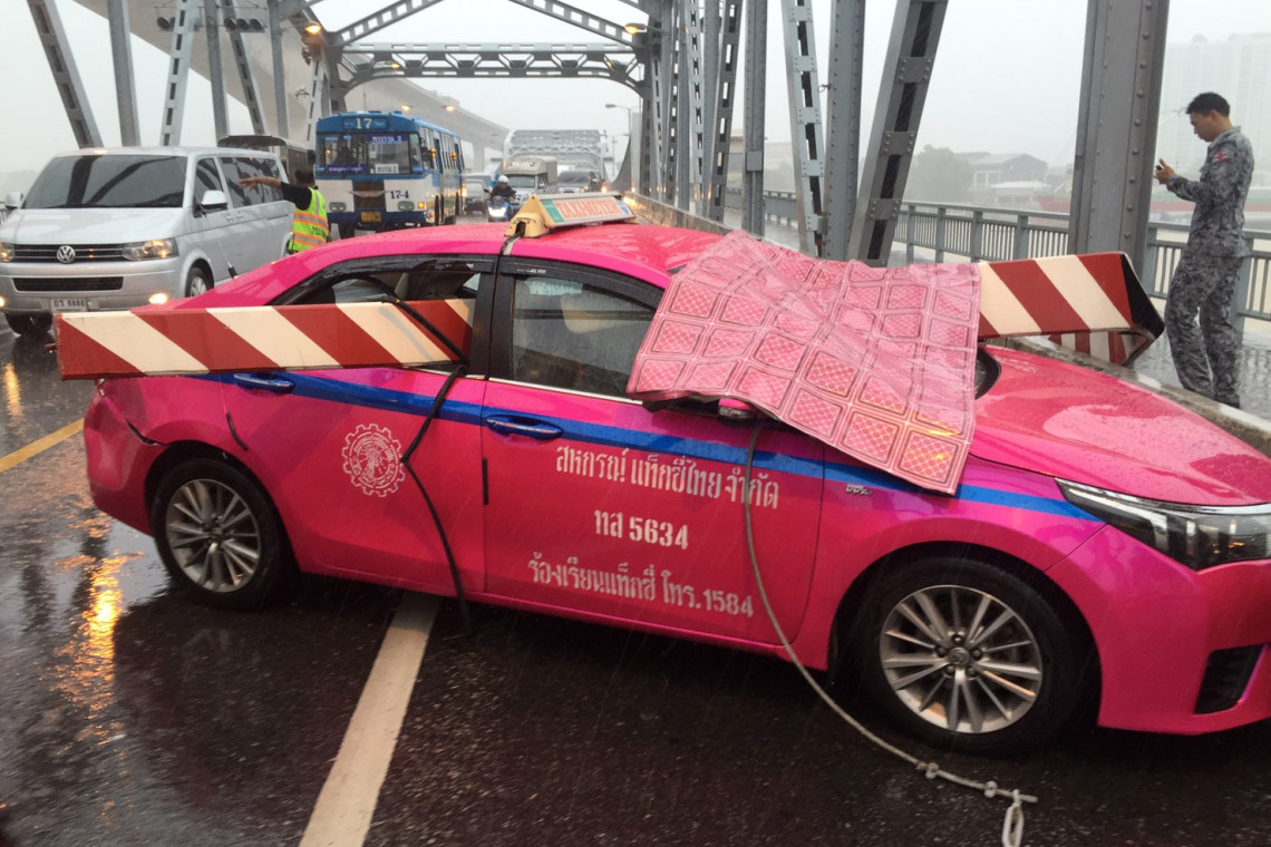 เมื่อเวลา 09.30 น.วันที่ 30 พ.ค.60 พ.ต.ท วีรวุฒิ มโนรส รอง ผกก.(สอบสวน) สน.บางคอเเหลม ได้รับแจ้งมีอุบัติเหตุ รถแท๊กซี่ชนเหล็กกั้นเปิด-ปิดสะพานกรุงเทพ บนถนนพระราม 3 มุ่งหน้าฝั่งธนบุรี แขวงบุคคโล เขตธนบุรี กทม.จึงรุดไปตรวจสอบพร้อม พ.ต.อ.เอนก ไพรศรี ผกก.สน.บางคอแหลม และเจ้าหน้าที่กู้ภัยมูลนิธิร่วมกตัญญู ที่เกิดเหตุพบรถแท็กซี่ยี่ห้อโตโยต้า รุ่นอัลติส สีชมพู ของสหกรณ์แท็กซี่ไทย จำกัด หมายเลขทะเบียน ทส 5634 กรุงเทพมหานคร จอดขวางอยู่กลางสะพานกรุงเทพ ในสภาพด้านหน้ารถมีเหล็กที่ใช้สำหรับปิดกั้นทางขึ้นลงสะพาน ยาวประมาณ 4 เมตร เสียบทะลุกระจกหน้าด้าน ทะลุทะแยงไปออกทางกระจกด้านหลังคนขับ เป็นเหตุให้นายพรหมมา ขันขวา อายุ 67 ปี อยู่บ้านเลขที่ 30 ซอยสุขสวัสดิ์ 30 แยก 7 แขวงบางปะกอก เขตราษฎร์บูรณะ กทม.ซึ่งเป็นโชว์เฟอร์ที่ขับมาเพียงลำพังได้รับบาดเจ็บที่ศีรษะและอาการหมดสติ เบื้องต้นหน่วยกู้ภัยได้ช่วยกันปฐมพยาบาลก่อนนำตัวส่ง รพ.เจริญกรุงประชารักษ์ ด้าน พ.ต.อ.เอนก กล่าวว่า ก่อนเกิดเหตุเจ้าหน้าที่กรมทางหลวงชนบท ซึ่งรับผิดชอบการควบคุมเครื่องปิดกั้นรถบนสะพานกรุงเทพ ได้รับการประสานงานจากทางเจ้าหน้ากรมอู่ทหารเรือ ว่า ในวันนี้เวลา 09.00 น.จะมีเรือหลวงสุรินทร์ผ่านเข้ามา โดยมีจุดหมายไปยังกรมอู่ทหารเรือ ย่านพรานนก กระทั่งเวลาประมาณ 08.40 น.ซึ่งเหลือเวลาอีกประมาณ 20 นาที จะถึงเวลานัดหมาย พบข้อมูลว่าเรือหลวงสุรินทร์ได้ผ่านมาถึงสะพานภูมิพลแล้ว ทางเจ้าหน้าที่ประกอบด้วย สน.บางคอแหลม สน.วัดพระยาไกร และ สน.บุคคโล จึงเตรียมความพร้อมอำนวยการจราจรในช่วงที่จะปิดกั้นรถบนสะพานกรุงเทพ เพื่อยกสะพานเปิดทางให้เรือแล่นผ่านมุ่งหน้าไปยังจุดหมาย “แต่นายอัมพัน เชยกุล เจ้าหน้าที่กรมทางหลวงชนบท ผู้ควบคุมระบบไฟฟ้าสั่งการเครื่องกั้นกลับไปใช้ไขกุญแจ เปิดเครื่องกั้นออกมาก่อน โดยยังไม่มีการประสานหรือรับคำสั่งจากทางเจ้าหน้าที่ตำรวจ ซึ่งกำลังเตรียมการณ์ท่ามกลางสภาพฝนตกกระหน่ำ ทำให้เหล็กเครื่องกั้นกระเด้งออกมาถูกกระจะรถแท็กซี่ เป็นเหตุให้โชเฟอร์ได้รับบาดเจ็บและการจราจรติดขัดนานกว่า 1 ชั่วโมง กว่าจะคลี่คลายสถานการณ์ได้ ส่วนนายอัมพัน หลังก่อเหตุได้หายหน้าไป ซี่งตำรวจจะติดตามตัวมาสอบสวนเพื่อดำเนินการตามกฎหมายอย่างเร่งด่วนต่อไป” พ.ต.อ.เอนก กล่าว