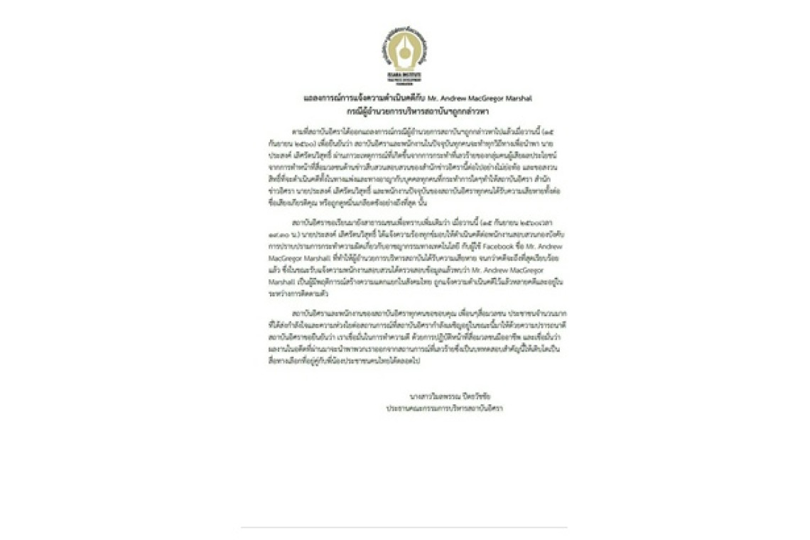 "อิศรา" ดำเนินคดีกับ "Mr.Andrew MacGregor Marshat" กรณี ผอ.สถาบันฯถูกกล่าวหา