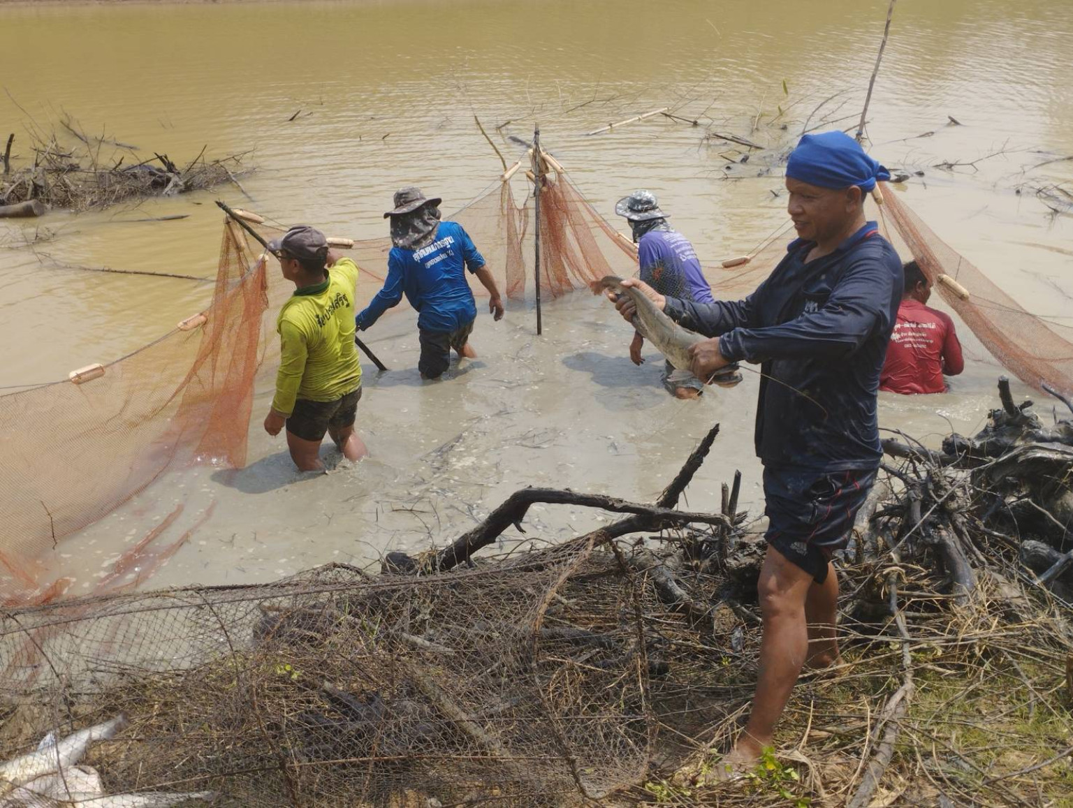 ส่วนการหาปลานั้นจะช่วยกันตัดกิ่งไม้ที่แห้งลงไปกองรวมกันไว้ในน้ำทิ้งไว้ 1 สัปดาห์ก็จะพากันไปจับปลาเรียกว่า"ไปกินข้าวป่า"คือไปกินกันที่จับปลา ในส่วนขั้นตอนการเอาปลาก็จะนำตาข่ายล้อมรอบกองไม่ที่แช่น้ำอยู่ จากนั้นก็เอาไม้ออกให้หมดก็จะเหลือแต่ปลาแล้วค่อยเอาตาข่ายขึ้นปลาจะมารวมกันแล้วเอาตะกร้าตักปลาขึ้นมาซึ่งจะมีทั้งปลาเล็กและปลาใหญ่